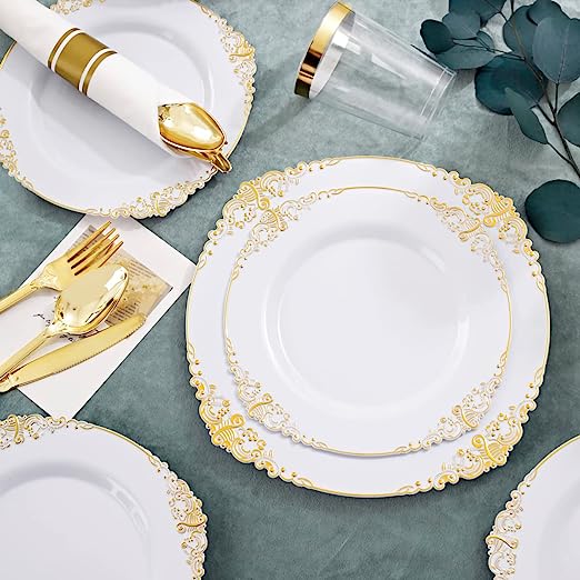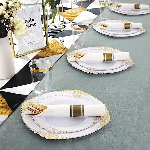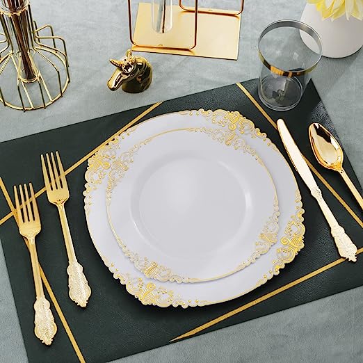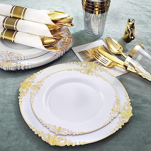PERFECT FOR ANY OCCASION: These white disposable bowls are designed for using at parties, weddings, luncheons, family gatherings, engagement parties, BBQs, Thanksgiving day, dinners, reunions, birthdays, fiestas, retirement celebrations, picnics, buffets, catering, food services and more! There is always a time when disposable gold plastic plates sets are convenient.